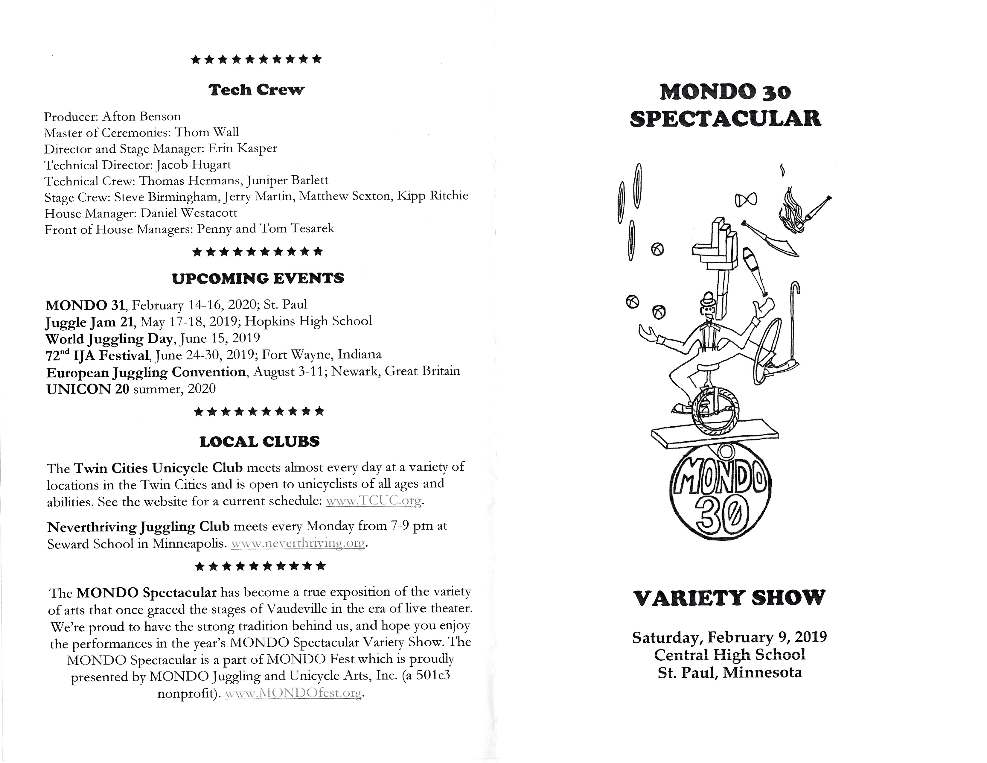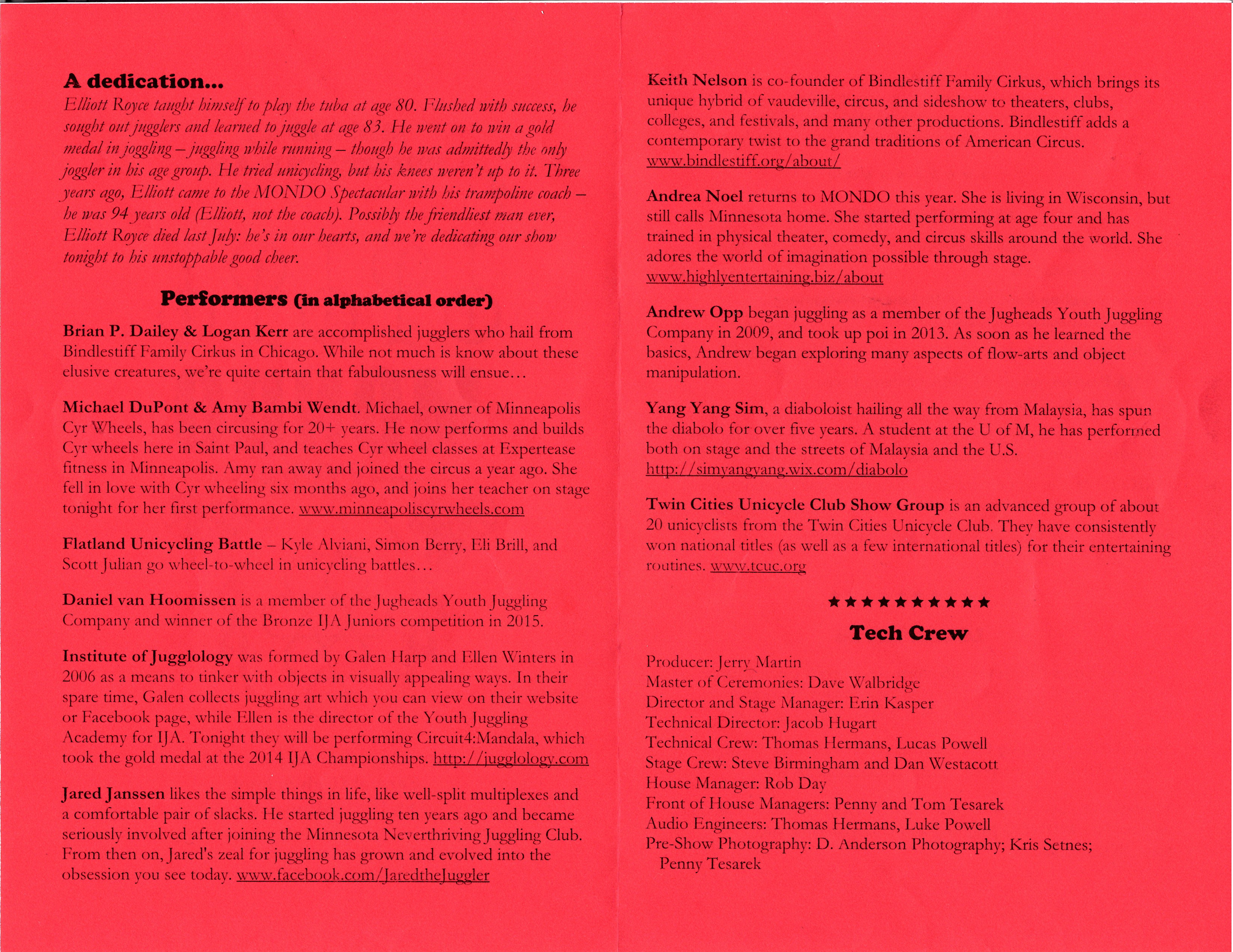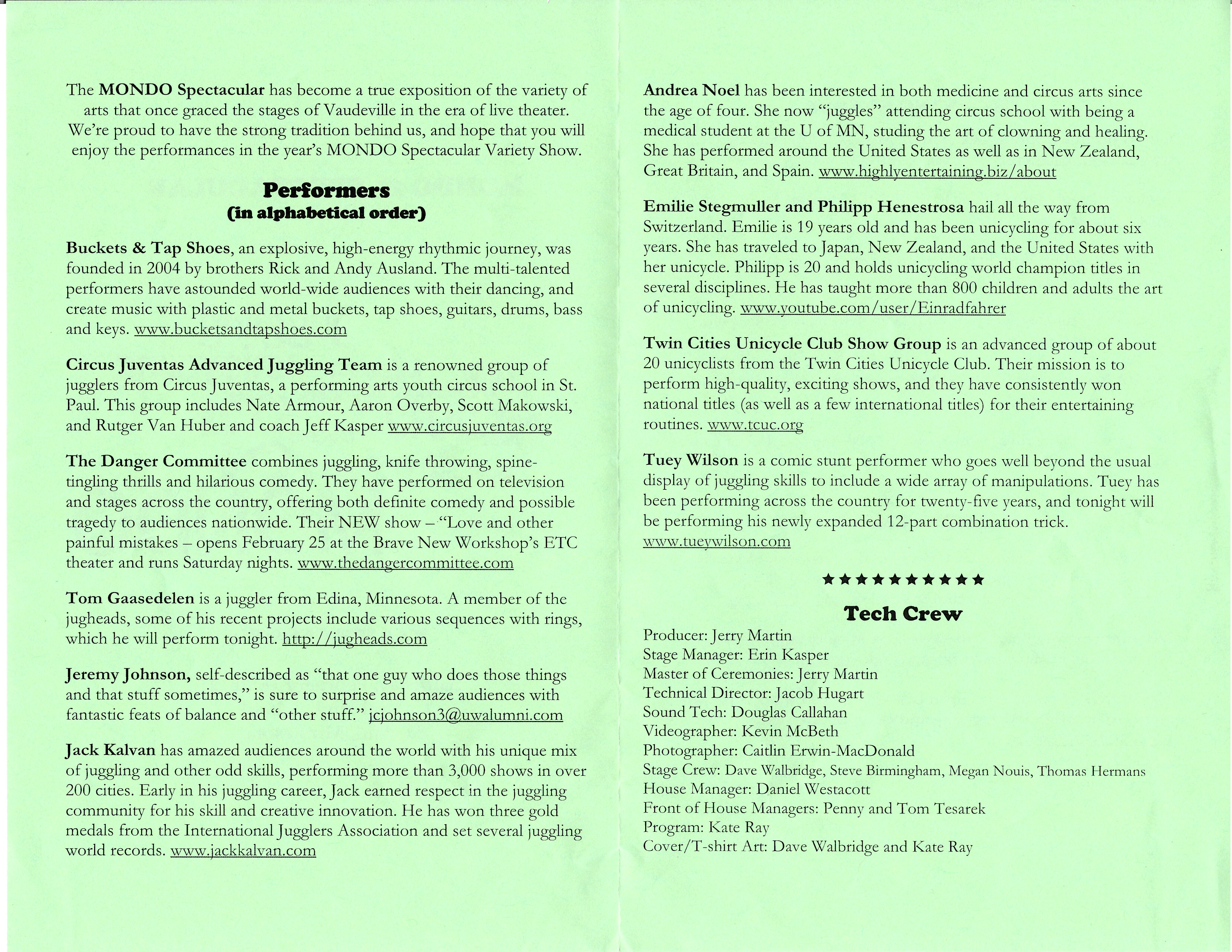 “As always, this show features top-notch talent from around the region performing new material, never before seen on the MONDO stage. U. of M. alumnus Craig Carlson headlines this year’s show, which also includes the Dew Drop Jugglers, No Strings Attached, the Twin Cities Unicycle Club and AirPlay!”